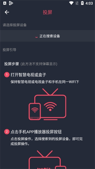 6、该软件还具备投屏功能。开启此功能后,软件将自动搜寻可投屏的设备,完成与投屏设备的绑定,就能畅享大屏高清画面。
