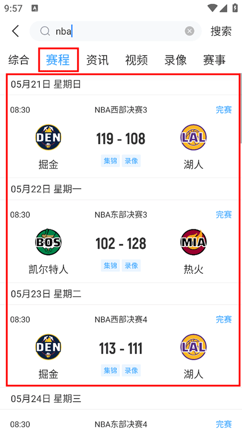 2、搜索后选择赛程页面,就可以看到近期的所有nba比赛的赛程表