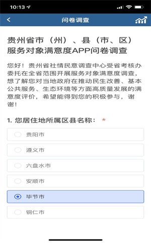 第一步,打开贵州统计发布官方版APP,进入手机主页。接着,点击“统计专区”,随后再点击“问卷调查”,之后点击贵州省市(州)县(市、区)服务对象满意度APP问卷调查,即可参与。完成问卷内所有问题的回答后,点击提交。