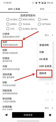 1若想借助GFX工具箱2022最新版提升刺激战场游戏画质,大家需先在主页顶端点击选择不同版本,涵盖国际服、国服、韩服、台服等八个版本,选择完毕后即可对画质进行自定义修改。