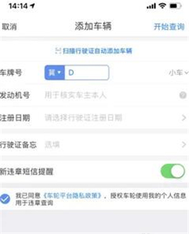 3、然后在添加车辆界面中的下方的选项输入对应的“车牌号”、“发动机号”及“行驶证注册日期”以及打开新违章短信提醒
