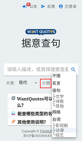 4、搜索框下方设有【大类】与【小类】选项,用户可依据自身需求选择相应类型。