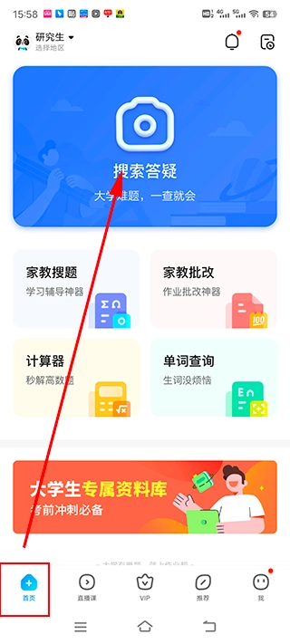 1、登陆进去后点击中间部分靠下处的拍照按钮,选择拍照搜题。