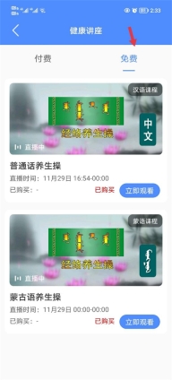 2、想要免费体验的用户可以点击免费栏,点击观看养生操。