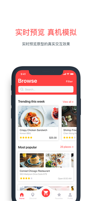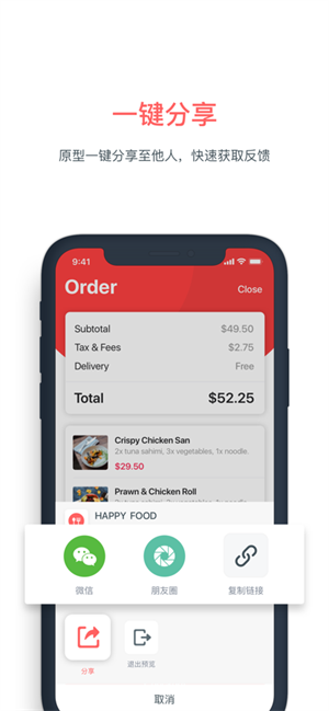 只需1步,快速添加页面交互,提供5种设备类型、24款真机外壳,手机直接演示产品交互,所见即所得。