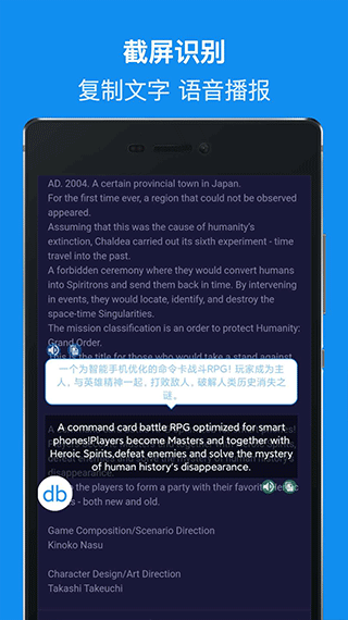 db翻译器免登录为用户提供了全屏翻译、截屏翻译、拖动翻译、文本输入等多种翻译功能,能够轻松满足用户在不同场景的使用需求,不管是游戏、漫画还是学习办公这款软件都可以轻松应对。