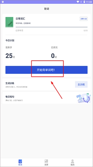 3、返回至首页,点击【开始背词】,即可开始进入每日计划学习。
