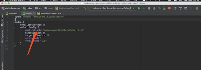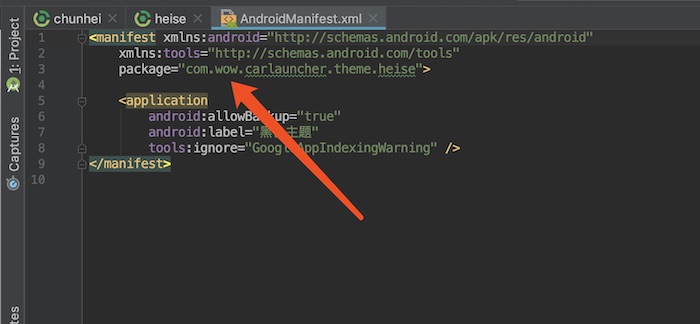 打开 androidmanifest.xml,找到如图所示的字符位置,修改成自己特殊的字符,比如 com.wow.carlauncher.theme.shenqifeixia.skin1,记住一定要选择一个大家不会使用的字符做标记,而且一定要用 com.wow.carlauncher.theme.做前缀,不修改或者重复的标记,可能会和其他人的冲突