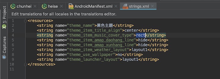 打开如图所示的 strings.xml 文件内容,theme_name 是主题的名字,用于显示的,必须添加,其他属性可根据需求添加,不添加即采用默认值处理,如下图资源文件修改