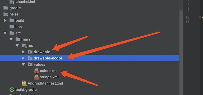 如图所示,这几个位置是资源目录位置,根据自己的要求修改即可,名字不能修改,drawable 目录下面的资源,可选择使用 xml 文件和图片文件,比如 theme_app_bg.xm 文件可以调换成 theme_app_bg.jpeg,两者只能存在一个,drawable-nodpi 目录下面的图片文件只能使用图片,不能替换成别的,资源文件修改参考 android 的开发规则,如下图