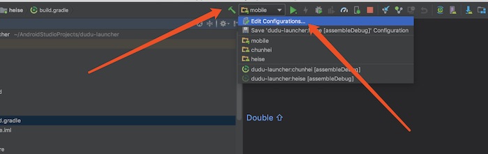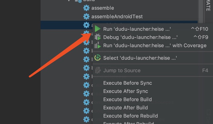 选择界面右边的 gradle,按照箭头所指,右击选择修改的模块的 assembledebug,右击选择运行
