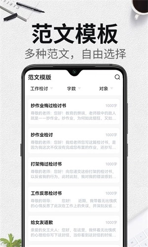这款软件一经推出,就给大家提供了诸多帮助。当你要写检讨书时,无需再费尽心思地琢磨。它能为你提供丰富的检讨文本内容,你可以保留需要的部分,让软件删除不需要的内容,然后再融入一些自己的想法就可以了。