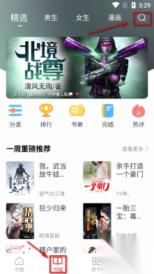 首先点击【书城】,接着点击右上角的搜索按钮。