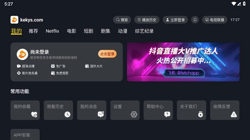 安装可可影视电视版,进入首页,能看到我的、推荐、netflix、电影、短剧、剧集、动漫、综艺等多个栏目。