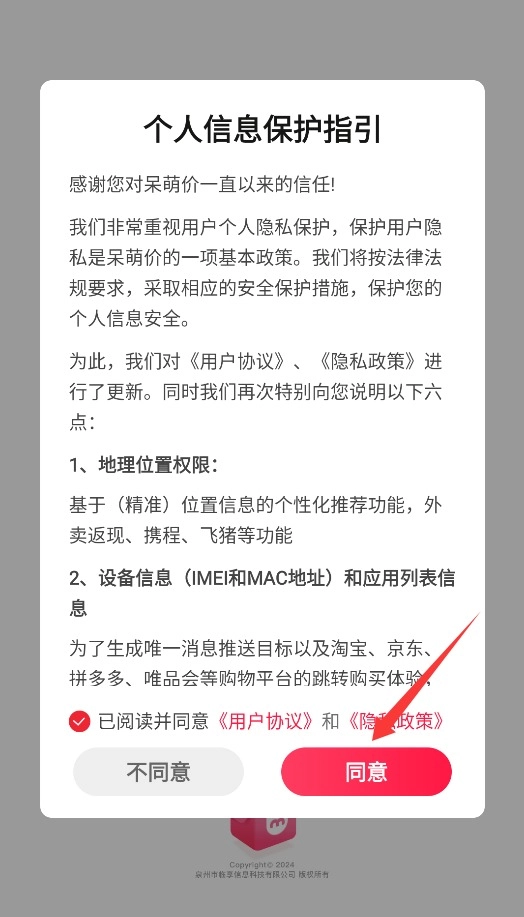 1、初次使用时,系统会显示用户协议与隐私政策,仔细阅读后点击同意并开始使用。