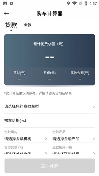 4、在买车前,你可以在软件中借助购车计算器,预先算一算你心仪车型的预计花费金额。