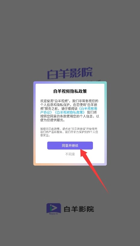 1、初次打开白羊视频需完整阅读用户协议与隐私政策,点击同意并继续进入登录界面。