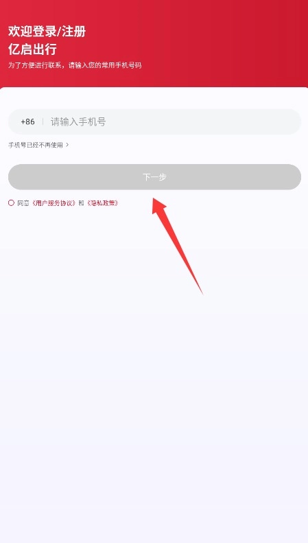 1、首次打开亿启出行,认真阅读用户协议和隐私政策后,点击同意按钮进入注册界面。