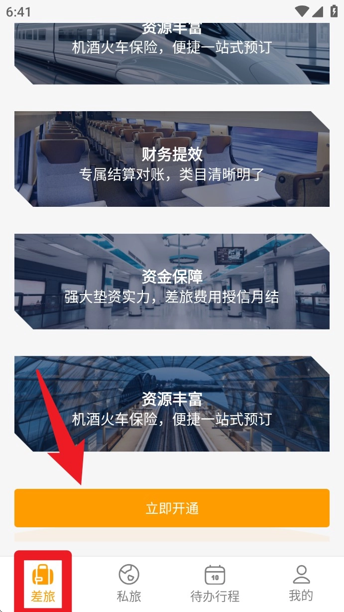1. 首先打开首页,接着点击左下角的“差旅”图标,随后即可进入企业出行相关页面,在此页面能够查看差旅资源以及功能优势。