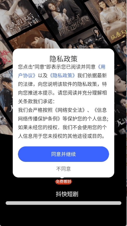 1.打开抖快短剧App,点击同意隐私政策与用户协议