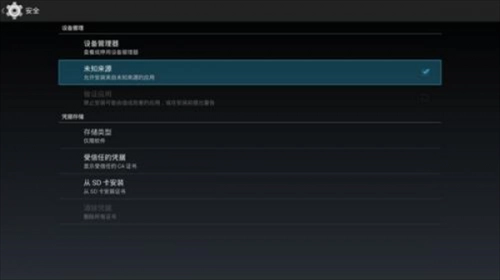第五步,开启智能电视及盒子,进入【设置】,接着找到【安全】,在【未知来源】对应的选项框中打钩,这样就能进行安装了。