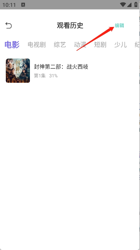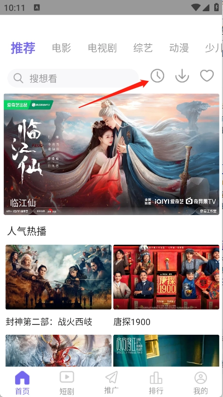 1. 开启ph影视App,待进入首页后,点击右上角的“历史”选项。