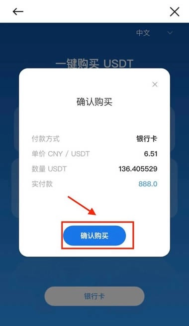 3、输入「购买金额」后进入一键购买页面,在此页面选择支付方式,例如「银行卡」、支付宝或微信,选择后进入核对弹窗页面。