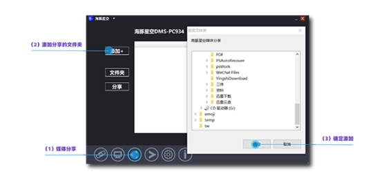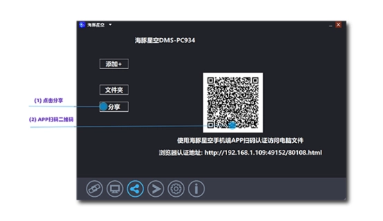 用手机扫描电脑发送端的分享二维码,随后在电脑中选择DMS,如此便能如同操控本地媒体资源一般,将电脑里的照片、音乐和视频投射至接收端。