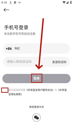 1、安装并打开听泉鉴宝,点击同意,同意隐私政策