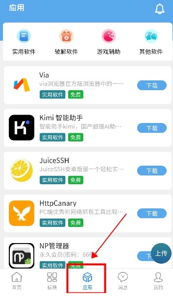 在应用板块,你可以看到各类实用软件,包括软件、游戏辅助,以及其他软件。