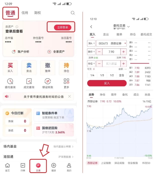 打开“西部证券” ➡ 【交易】选择“普通”,点击“立即登录”即可登录交易账户