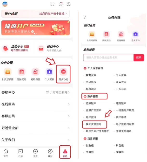 操作步骤如下:首先打开“西部证券”,接着在【我的】板块中选择“业务办理”,进入后点击“更多功能”里的“账户管理”,最后找到并点击“找回资金账号”。