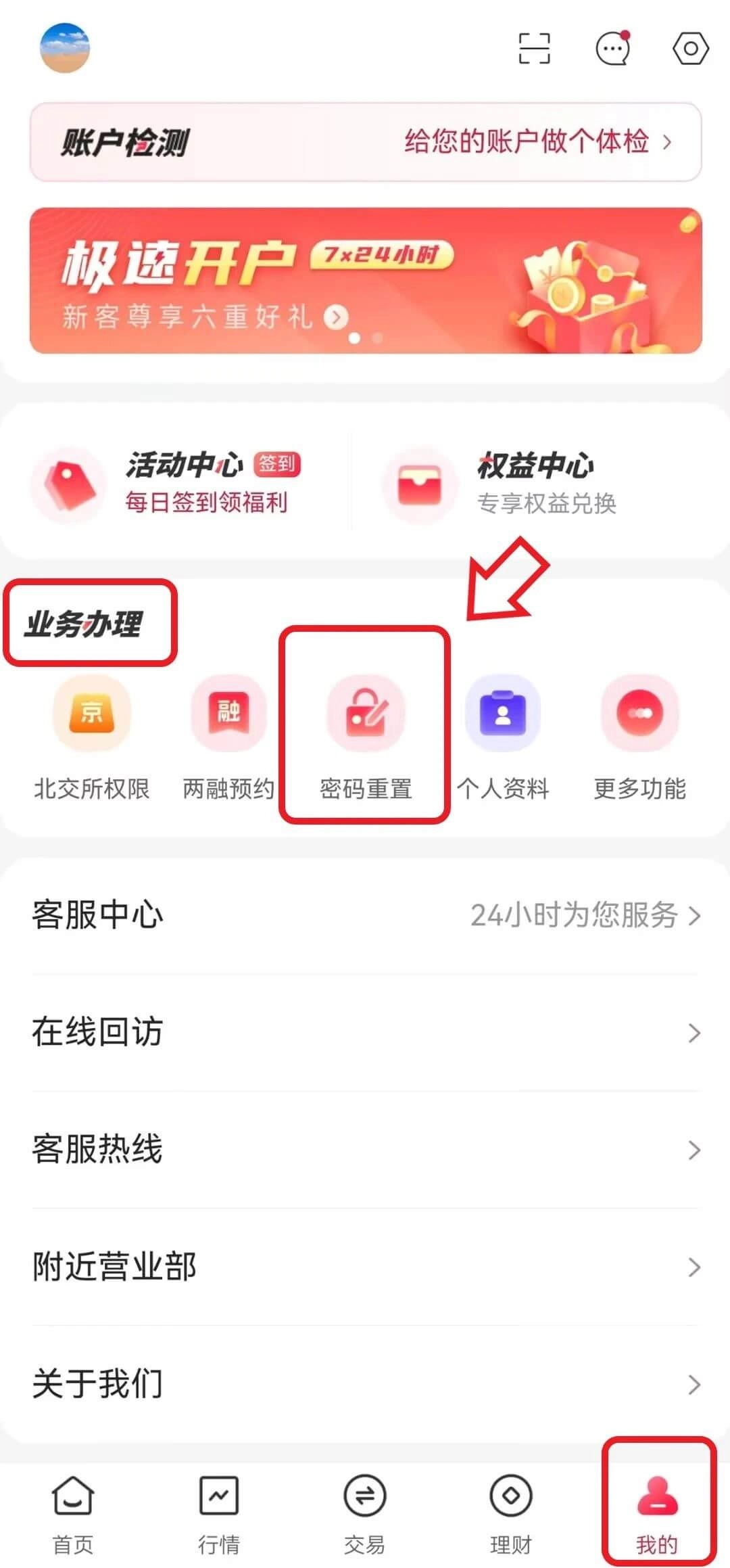 打开“西部证券” ➡ 【我的】选择“业务办理”,点击“重置密码”按照页面操作指引进行办理