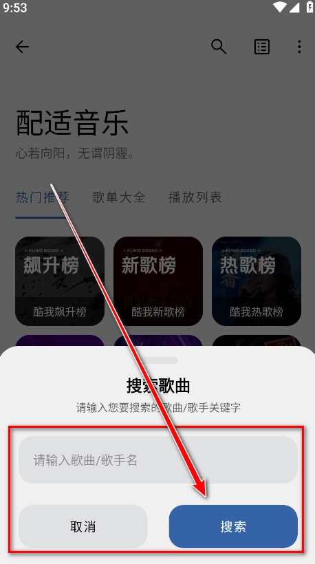 2、输入搜索关键词:于搜索栏内输入歌曲名称或者歌手名称,接着点击“搜索”按钮,以查找您心仪的音乐。