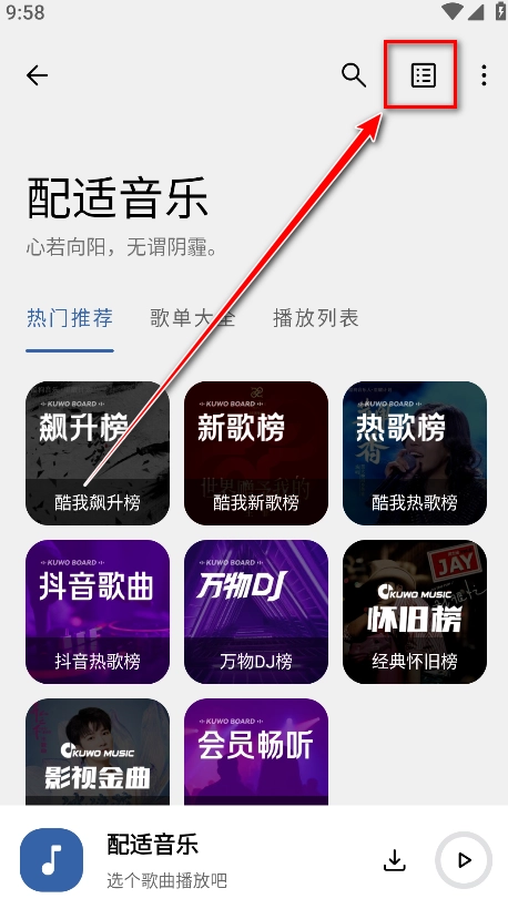 1、接着打开适配音乐:需从本网站安装适配音乐3.2.1 。安装结束后,开启该应用,然后点击右上角的放大镜图标,从而进入搜索界面。