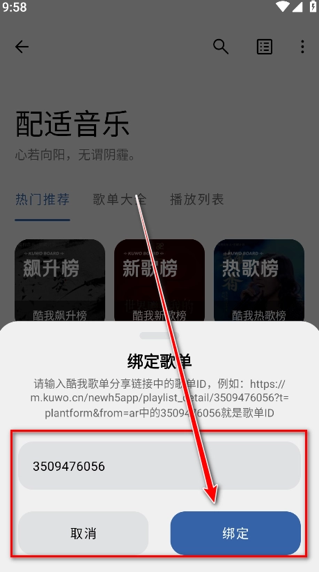 2、绑定歌单ID:仔细阅读页面提示,在指定区域输入您的歌单ID ,输入完毕后,点击“绑定”按钮,完成歌单连接。