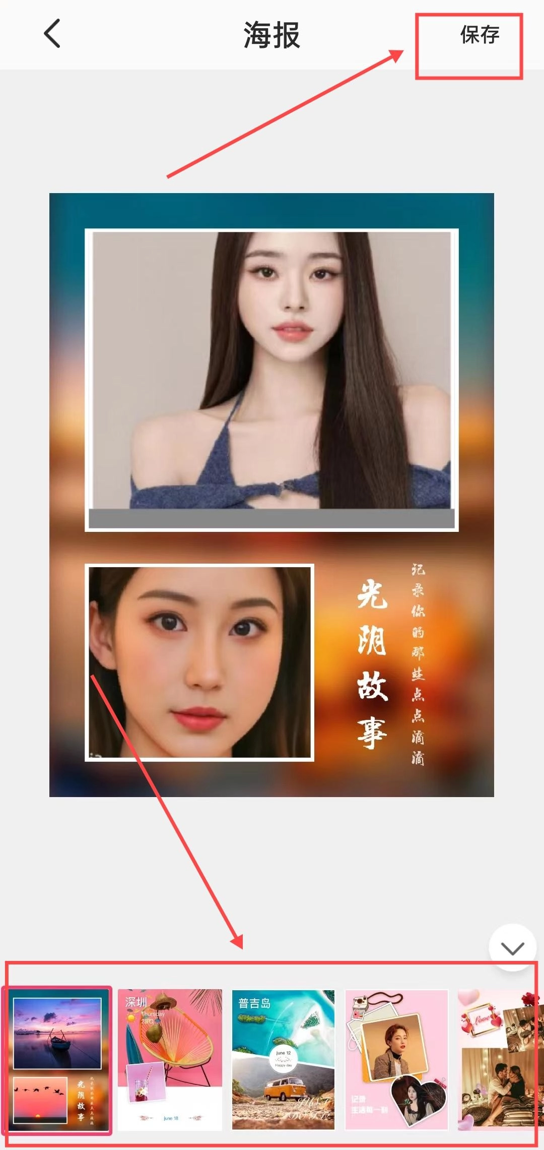2、挑选两张及以上照片进行拼接,编辑完成后,点击右上角的保存按钮。