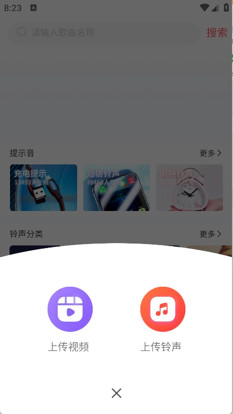 3、点击中间的“+”号可以进行上传视频或上传铃声。