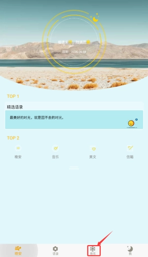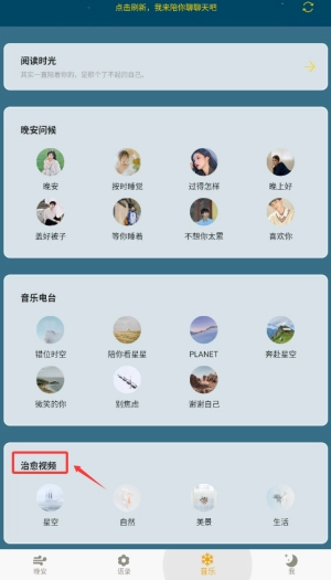 1、启动晚安语录后,在底部导航栏选择"音乐"频道,这里汇集各类治愈系音乐视频。