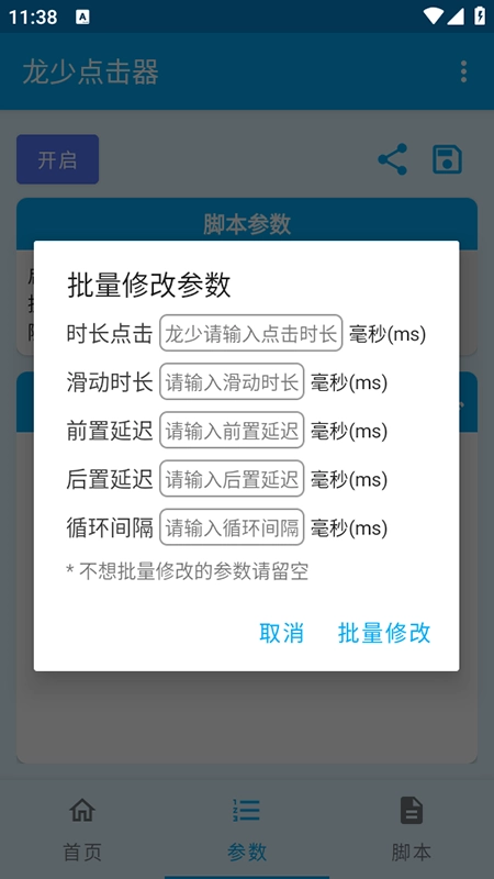 2. 打开“参数”界面,对默认点击时长(例如75毫秒)、滑动时长(例如350毫秒)、执行次数(0代表无限)以及启动延迟等进行设置。这些参数能够依据实际需求通过测试来加以调整。