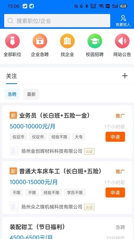 输入职位或企业名称可帮助你快速找到对应的岗位,并能立即查看详情并申请;
