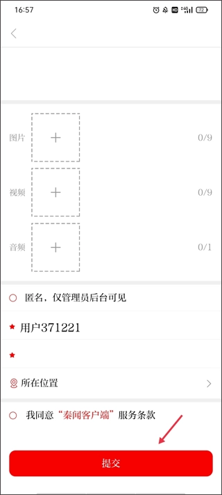 2、填入报料标题、内容并上传图片,若想匿名举报可进行勾选,同时勾选下方服务条款后,点击“提交”即可。