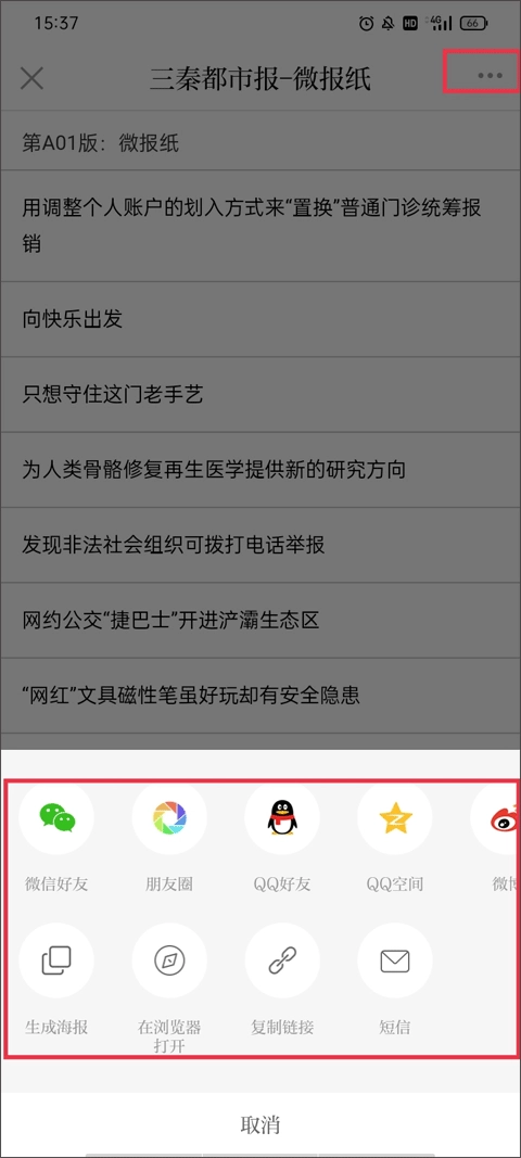 2、在下方能够切换报纸的期刊或日期。要是你打算分享给好友,或者保存至手机,点击右上角的“…”,从下拉的功能选项中选择相应操作即可。