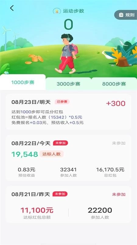 这里有详尽的个人运动数据,依据不同步数获取不同额度的费用,助力你轻松收获丰厚收益,享受更为贴心的服务。走路赚钱器免费版还会不定时为用户举办比赛活动,用户可在线查看活动详情,方便选择是否参赛。参与比赛不仅有机会获得名次,还能赢得运动奖励。