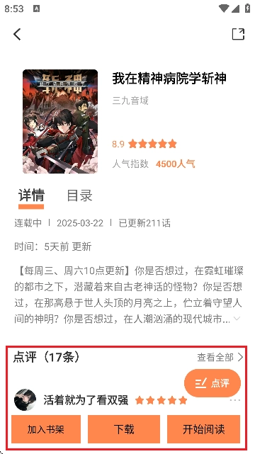 4、随意点击一部作品的封面,即可进入该作品的详情页,如图所示。在此页面,能够把作品添加到书架,还能进行点评、查看目录等操作。