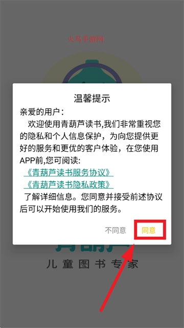 先进行青葫芦读书的安装操作,安装完成后打开该应用。当出现温馨提示界面时,点击“同意”选项。