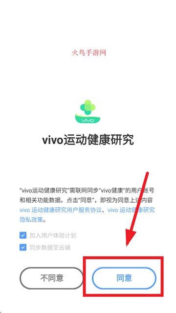 请先安装vivo运动健康研究应用程序,安装完成后将其打开。当出现用户服务协议以及隐私政策提示界面时,点击“同意”选项。