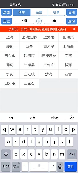 2. 输入站名时,可使用站名的拼音首字母,例如:上海(SH)、杭州东(HZD)。