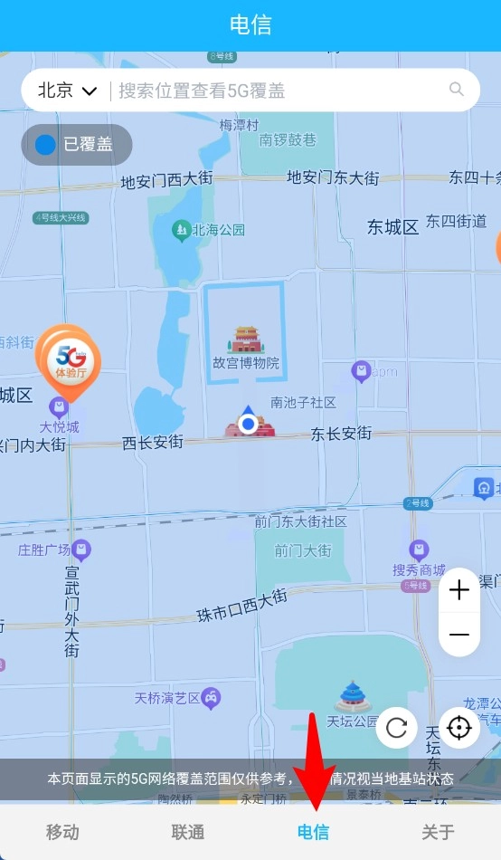 3、点击下方“电信”按钮,进入中国电信5G网络查询页面。