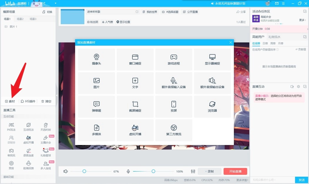 【多场景直播全覆盖】支持摄像头开播、录屏开播以及手机语音开播等多样模式。无论是游戏直播、娱乐直播,还是语音直播,皆能满足。一键轻松获取直播权限,下一个主播就是你!